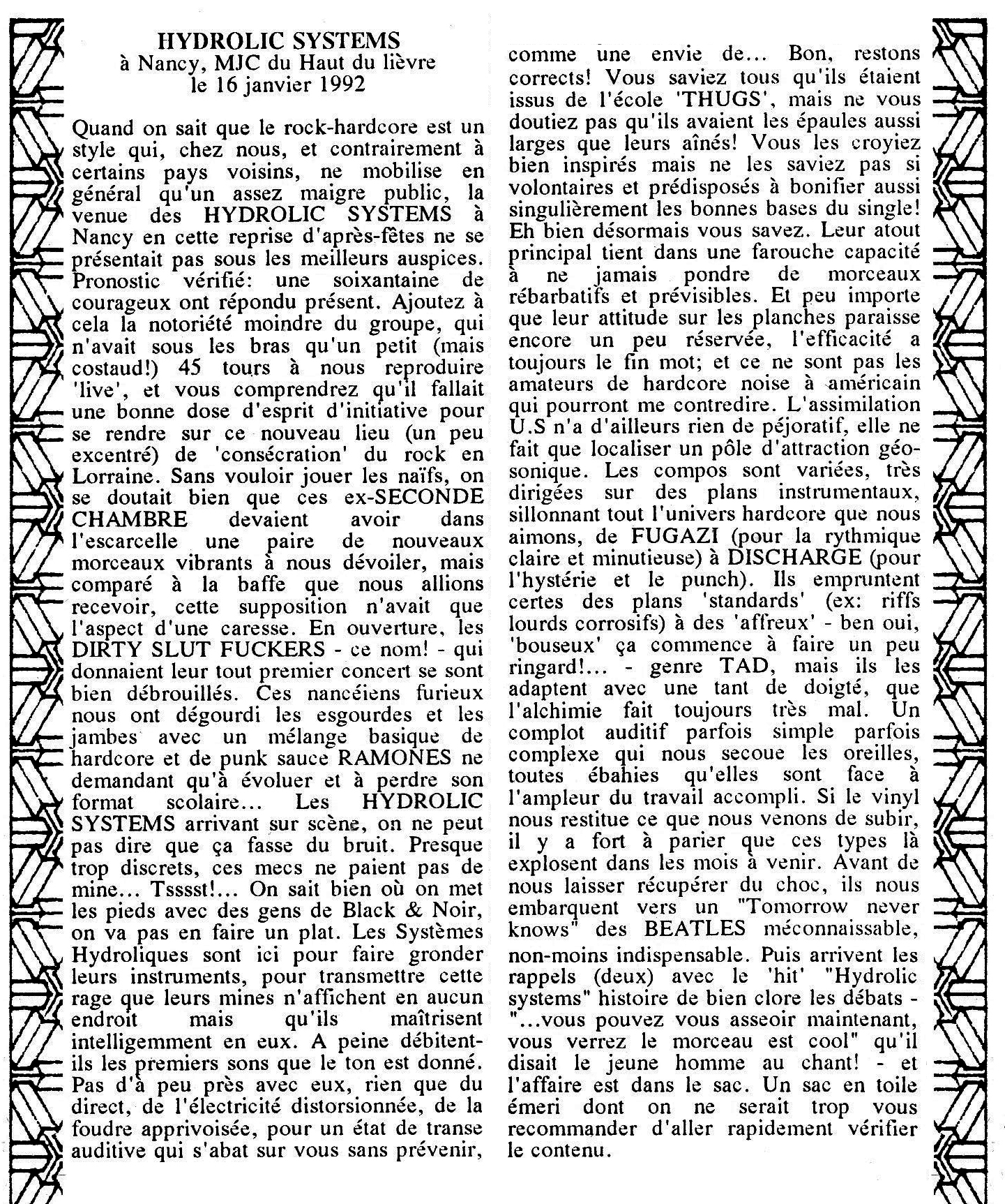 Live report du concert de Hydrolic Systems à Nancy le 16 janvier 1992, extrait du fanzine Hyacinth 8ème floraison, mars 1992 : instructif et alléchant.