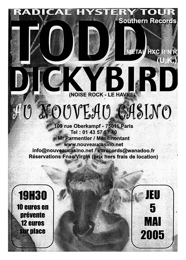 • Mars 2001 : Enregistrement d’une seconde démo de travail pour le futur album avec Sylvain Champion, sonorisateur du groupe, lors d’une tournée avec Kill the Thrill. Parallèlement, Dickybird travaille au sein d’Extreme Teenagers et assure de nombreux collages d’affiches pour financer son projet d’enregistrement aux USA.