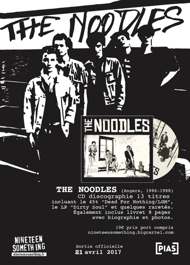 Hell Yeah ! Enfin ! Le CD des Noodles est là. Enfin, presque. Officiellement, il sera disponible le 21 avril 2017 5 mai 2017, date de sa sortie nationale ! Après Casbah Club, Hydrolic Systems et Scuba Drivers, la quatrième référence de notre Club Nineteen (*) aura mis le temps pour voir le jour, mais l’attente valait vraiment le coup. Redonner une seconde (une meilleure ?) chance aux morceaux de ce groupe angevin des années 80 n’est pas une vaine mission… Sacerdoce ? Si vous voulez. On a aimé le rock écorché des Noodles durant sa courte existence (1985-1988) et après leur disparition, on a continué à écouter leurs disques parce que lorsqu’un groupe est bon, il l’est à jamais !