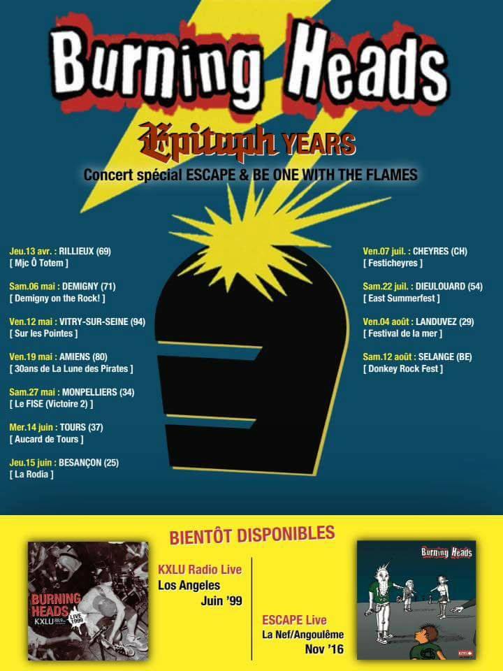 Le CD KXLU live 1999 sera distribué par PIAS France (donc trouvable chez tous les bons disquaires), mais également disponible sur le shop de Nineteen Something contre 10,00 € port compris et bien entendu il sera en vente sur le stand du groupe lors de ses prochains concerts. A ce propos, notez que les Burning Heads donneront des concerts spéciaux Epitaph Years lors des prochains mois (cf. flyer ci-dessous).