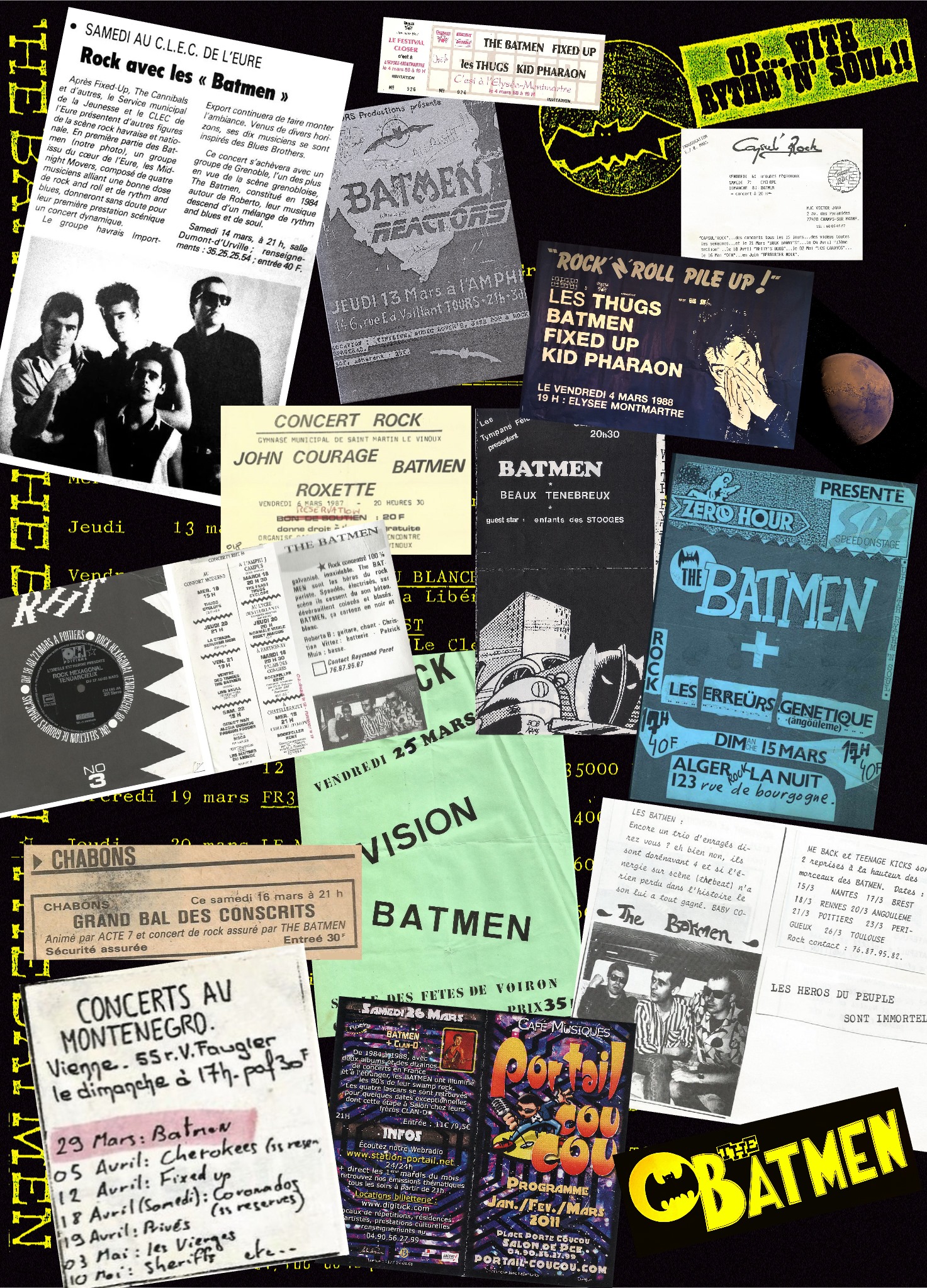 « Janvier 1984 : à un jet de médiator de la gare de Grenoble, de la litière improbable des groupuscules progressifs et de combos new-waveurs, naissait le glorieux concept du rhythm and soul. La première chose qui saute aux yeux quand on se penche sur la naissance du groupe c’est l’envie de jouer de ces trois-là et l’intervention décisive d’un hasard plus que favorable : les Batmen agissent sans calcul, ni préméditation. Envie de jouer, elle est évidente. C’est elle qui explique la présence à la fin des années 70 de Christian et Patrick dans des formations incongrues qui ont nom Gloria Footing ou Bändi : directions musicales à géométrie variable et réputation très, très locale, mais aussi concerts en Finlande ou à Barcelone. La même grâce à qui Roberto se retrouve partie prenante des Interimers, une de ces nombreuses formations à boite à rythmes qui fleurissent en 80, où il tentera, sans trop de succès, de préserver les prérogatives du rock face à la machine.