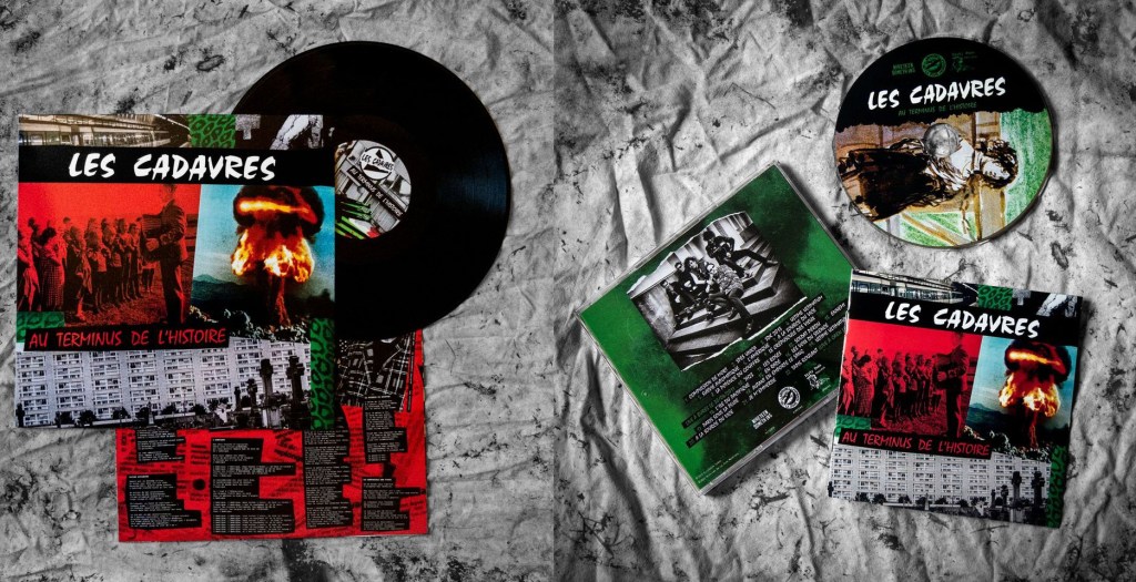 2- En 2013, Les Cadavres, fraîchement reformés et réénergisés par des concerts aux quatre coins de la France, enregistrent Au Terminus de L’histoire, soit 9 morceaux qui sortiront par grappe de trois sur 3 EP séparés et édités par trois labels différents (Dirty Punk Records, Slow Death et Guerilla Asso). Cette série de EP vinyle sera rapidement sold out. Revoici donc Au Terminus de L’histoire en format LP (avec 2 bonus live en prime) et CD (avec 13 titres live en plus).