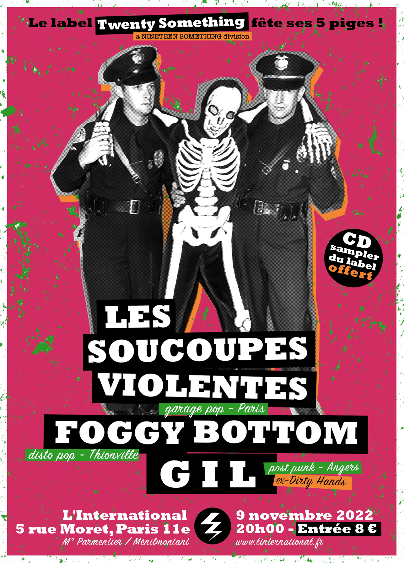 Notre division « musique actuelle » Twenty Something fête ses 5 piges. Pour célébrer cette moitié de décennie, trois des groupes du label animeront une soirée d’anniversaire le mercredi 9 novembre 2022 à l’International (Paris, 11e) : Les Soucoupes Violentes (garage pop, Paris), Foggy Bottom (disto pop, Thionville) et GIL (post punk, Angers).